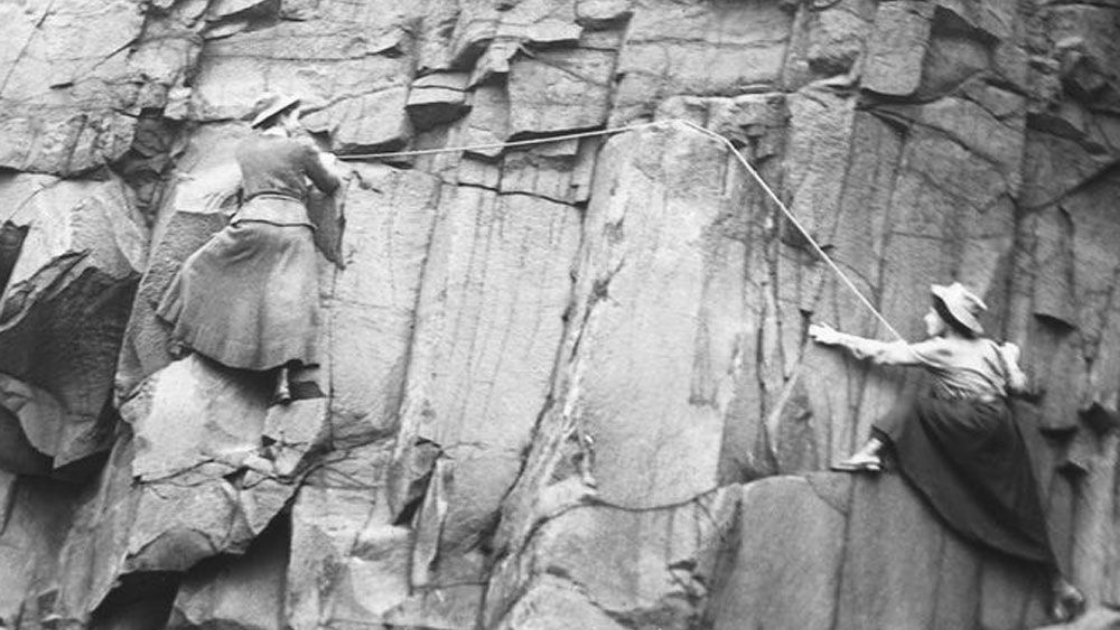 Lucy Smith and Pauline Ranken ascending Salisbury Crags, Edinburgh, wearing long, ankle-length skirts, hats, blouses and smart shoes, 1908. The only protection they had was a length of rope tied around their waists – no helmets, harnesses, spikes or other modern safety equipment as it wasn’t available at the time.
